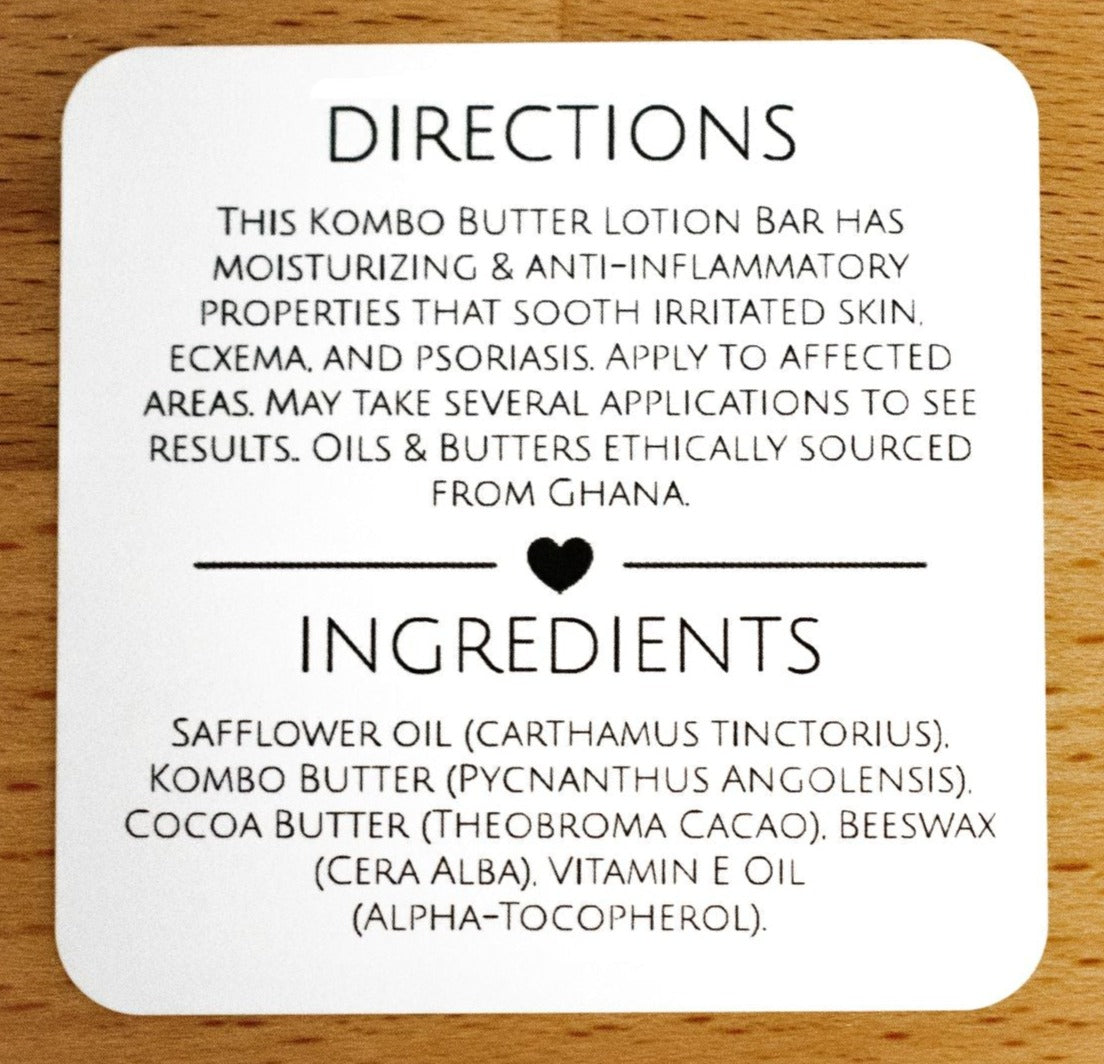 Kombo Butter, Cocoa Butter, Beeswax, Vitamin E Oil, and Safflower Oil